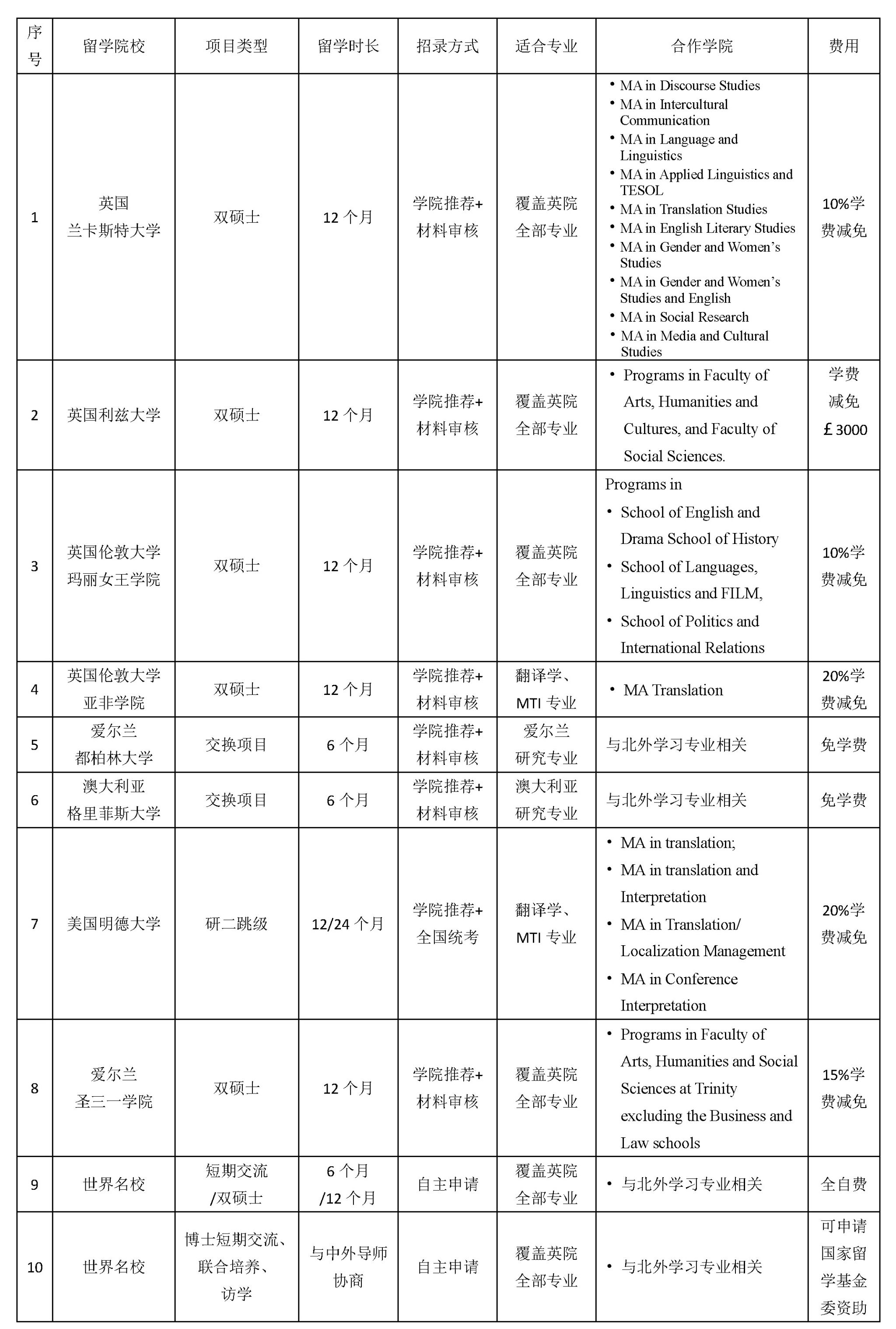 澳门pg官方电子平台研究生(含硕士生和博士生)短期留学项目旨在培养国际化复合型人才,为学生提供赴世界名校交流学习的机会。硕士生出境交流时间须在完成一年学习之后根据具体情况确定,博士生须与导师商量后确定。短期留学项目注重夯实学生专业功底,提升学生的专业素养、跨学科能力及国际竞争力,助力学生全面发展。学生在外就读专业与北外在读专业相关,所修学分得到认可,可计入毕业学分。各项目简要介绍请参见下表。