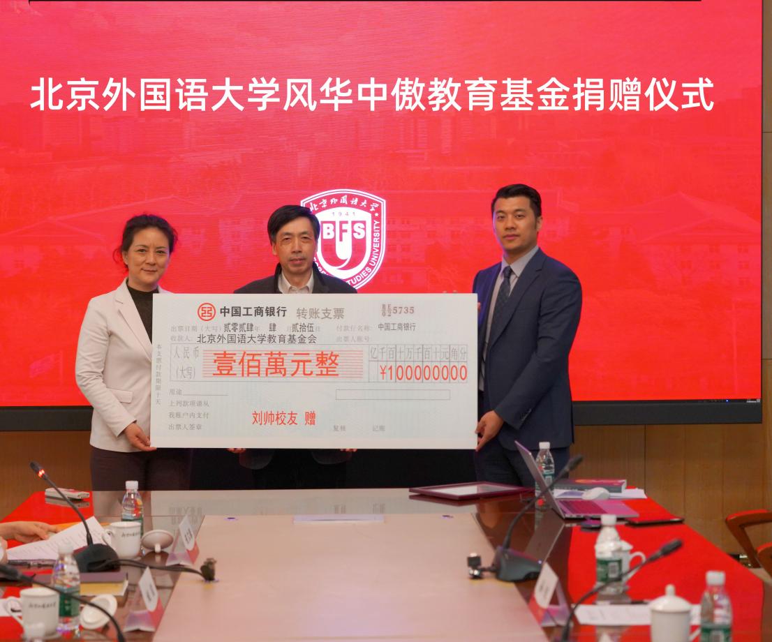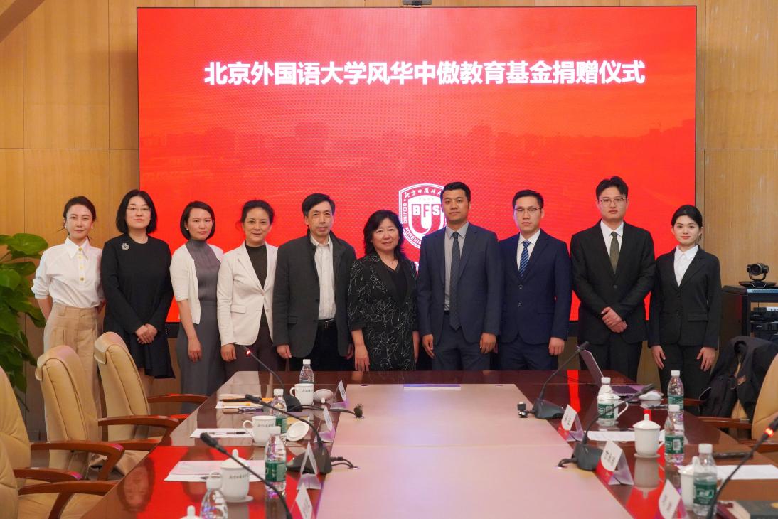 4月25日,北京外国语大学风华中傲教育基金捐赠仪式在行政楼507会议室举行。北京风华中傲教育科技有限公司向北外捐赠人民币100万元,专项用于奖励澳门pg官方电子平台在校生,包括奖励演讲、口译、模联等国家级赛事的获奖选手,以及资助经济困难的贫困生。