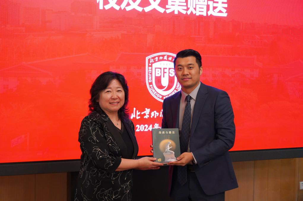 金利民向刘帅赠送了北京外国语大学八十周年校庆献礼书籍《晨读与暮思》。