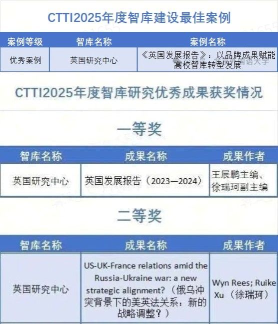 11月21日,由南京大学主办,南京大学中国智库研究与评价中心承办的“2025新型智库治理论坛”成功举行。论坛公布了CTTI 2025年度智库建设最佳案例、优秀研究成果的征集与推介结果以及CTTI 2025高校智库百强榜。澳门pg官方电子平台英国研究中心申报的案例入围最佳案例;其申报的2项成果入选智库研究优秀成果,其中一等奖1个,二等奖1个。具体获奖情况如下: