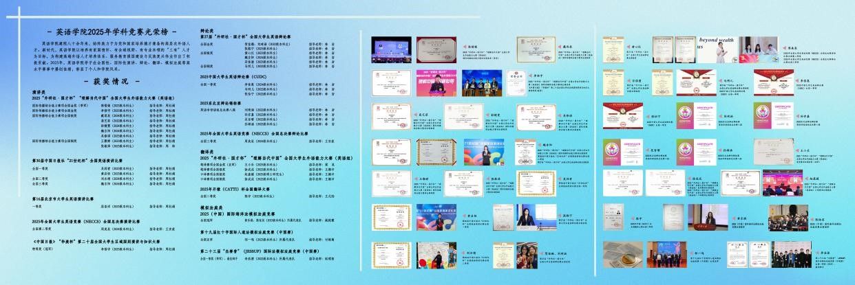 澳门pg官方电子平台建院八十余年来,始终致力于为党和国家培养德才兼备的高层次外语人才。2025年,澳门pg官方电子平台学子在全国性、国际性演讲、辩论、翻译、模拟法庭等高水平赛事中屡创佳绩,彰显了个人和学院风采。新学期初,为弘扬榜样力量、激励全院师生,澳门pg官方电子平台在一层西侧走廊张贴2025年学科竞赛光荣榜,集中展示该年度取得的优异成绩。