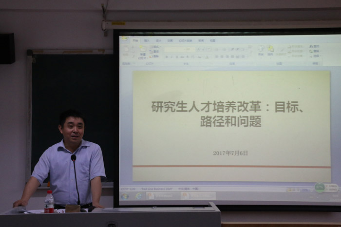 ——在7月6日上午的研究生人才培养改革研讨会上,副院长王展鹏教授和谢韬教授分别作了题为“澳门pg官方电子平台研究生人才培养改革:目标、路径和问题”和“研究中心的科研职能与研究生培养”的发言。全院教师围绕“如何提高研究生生源质量”、“如何提高研究生培养质量”、“如何引导学生参与学术活动和科研工作”等问题展开了讨论。