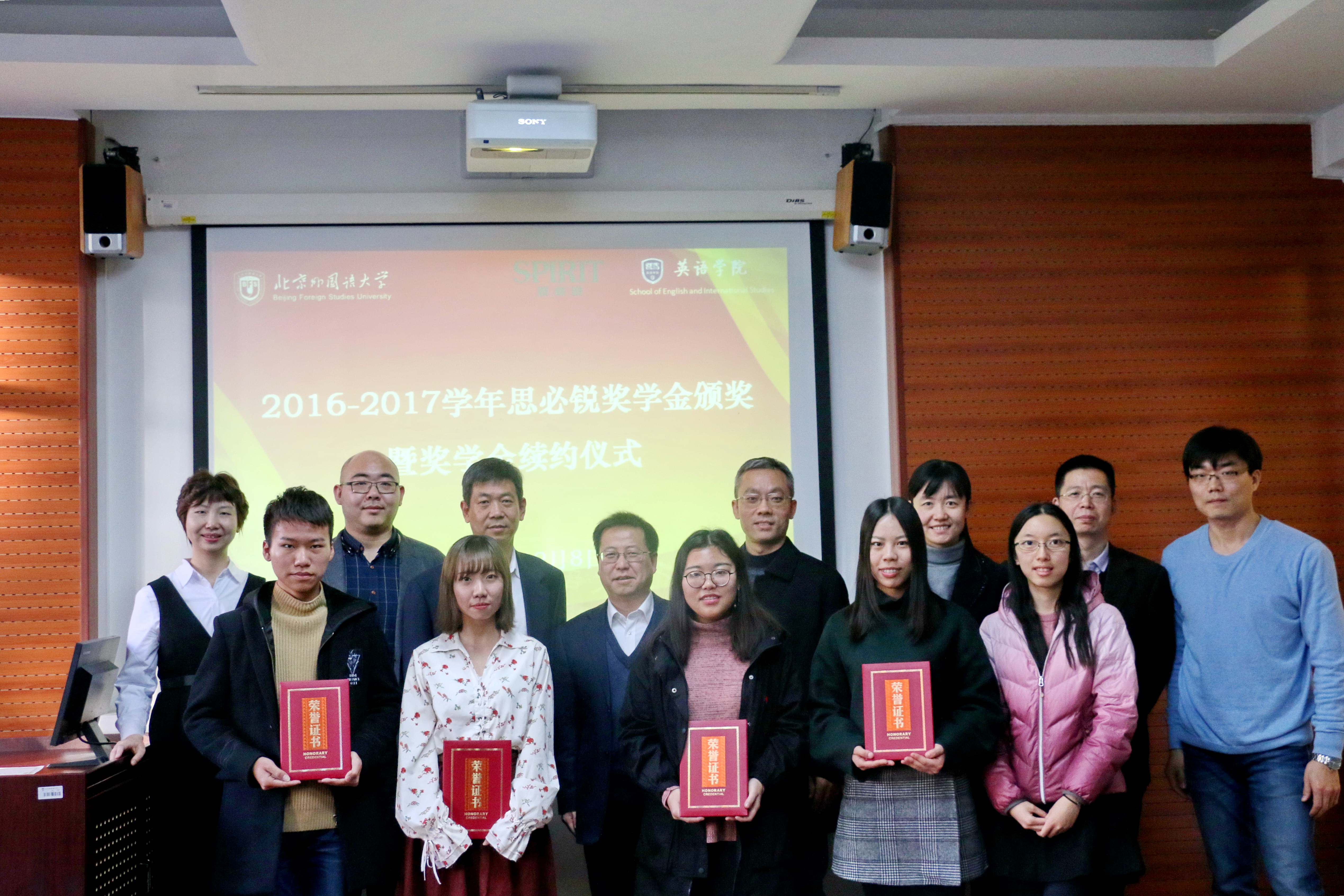 ——路兴首先代表学院对思必锐公司多年来对学院人才培养工作的大力支持表示感谢。他首先从招生类型及培养方案、师资队伍建设、教材建设等方面向大家简要介绍了学院近几年的改革发展情况,随后展示了从2012—2016学年历年获奖学生的工作去向或在校学习情况,其中包括服务国家部委的工作人员、就职于企业的外事人才、在大学工作的科研助理、中学任教的骨干教师,以及在海外或国内知名院校继续深造的优秀学子。2016—2017学年获奖学生也分别做了自我介绍,并对学院的培养和思必锐公司的支持与鼓励表示感谢。