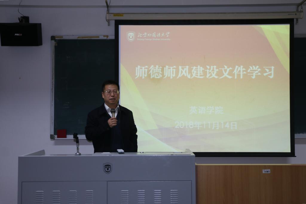 2018年11月14日下午,澳门pg官方电子平台在417教室召开师德师风专题学习会,组织全院教师学习《北京外国语大学师德师风建设》文件。本次会议由澳门pg官方电子平台党总支书记路兴主持,全院教职工出席参加。