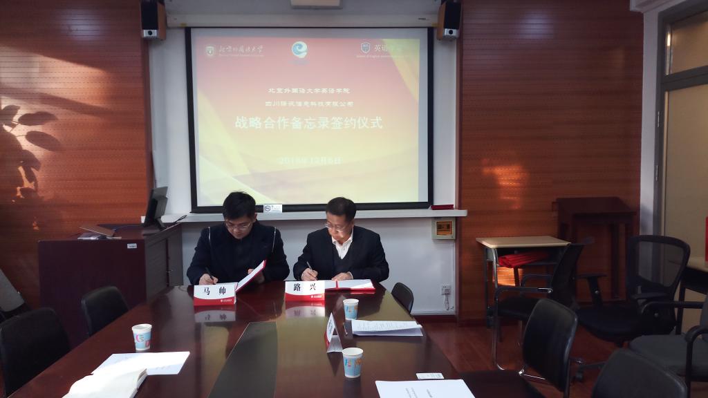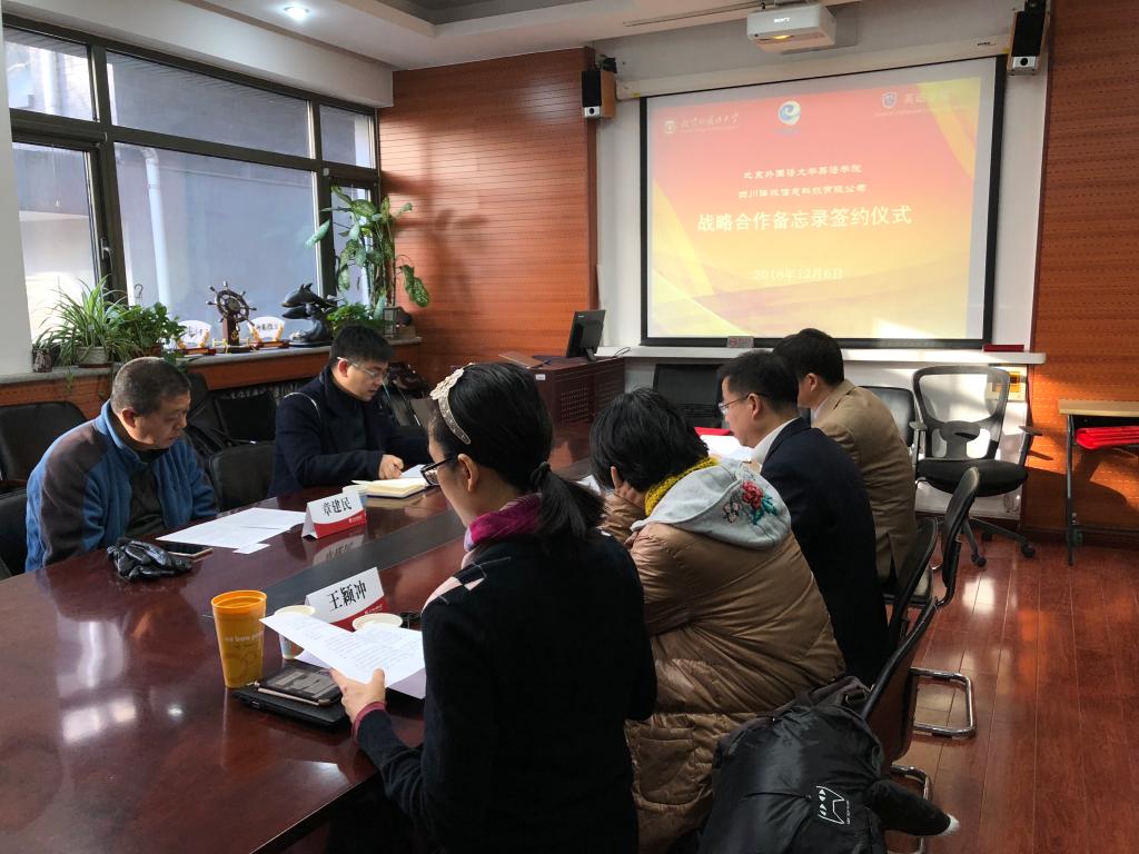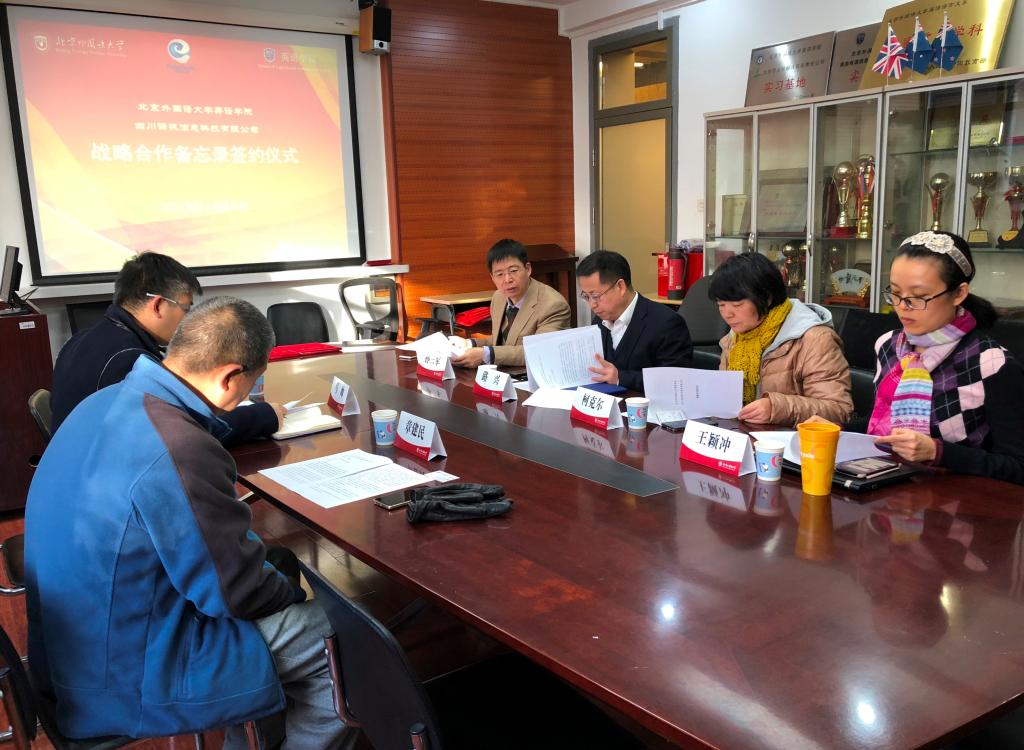 2018年12月6日,澳门pg官方电子平台与四川译讯信息科技有限公司校企战略合作备忘录签约仪式在澳门pg官方电子平台会议室举行。党总支书记路兴、MTI翻译中心主任孙三军、翻译系教师柯克尔、王颖冲,译讯科技CEO马帅、副总经理章建民参加。仪式由孙三军主持。