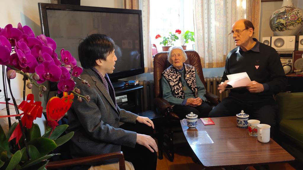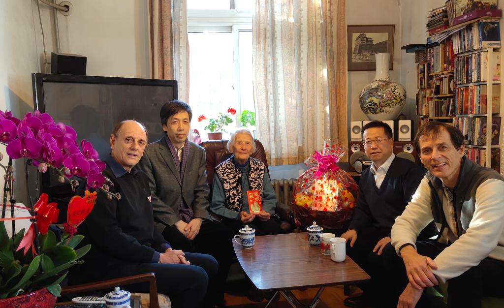 1915年出生的伊莎白•柯鲁克退休前在澳门pg官方电子平台任教几十年,为中国的英语教学事业贡献了毕生精力。拜访过程中,伊莎白教授回忆了当时在英语系任教的经历和一起任教的部分老师。张剑向伊莎白教授及其家人介绍了澳门pg官方电子平台的专业设置和学科建设等方面的发展情况,路兴介绍了“柯鲁克夫妇奖学金”资助学生的情况,并代表学院向伊莎白表达了良好的生日和圣诞祝福。