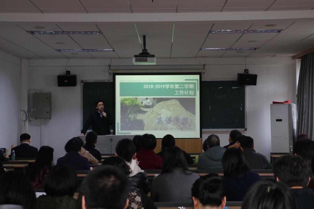 会上,澳门pg官方电子平台院长张剑分别从学科建设、教学工作、科研工作、国际合作、党建及学生工作和人事工作六方面对学院新学期的工作进行部署。学科建设方面,学院本学期将继续做好慕课建设、南太平洋语种建设与师资培养工作,同时,着手外交外事高级翻译专业建设。本科教学方面,本学期将完成本科二年级学科方向分流工作、继续开展写作和语音辅导、筹备教学开放周活动等,同时,本科生毕业论文答辩工作也将在本学期进行;研究生教学方面,将落实MTI专业校外实践导师机制,探讨MTI专业设置、研究生教学督导、语言学专业定位等问题,同时也需保证硕士、博士研究生的招生、毕业论文答辩等环节顺利开展。科研工作方面,学院鼓励教师积极申报一流学科建设项目、基本科研业务经费、国家社科基金等项目,也将推进教育部国别区域研究基地、索引智库、备案中心等工作和研究生相关学术活动。国际合作方面,学院将与世界著名大学积极往来、增加合作,完成外教招聘和选派学生出国等工作。党建及学生工作方面,学院本学期将继续加强理论学习,做好党员培养与发展工作,指导帮助学生学业与职业发展及就业工作、促进学生身心健康。此外,将积极开展工会及校友相关工作。