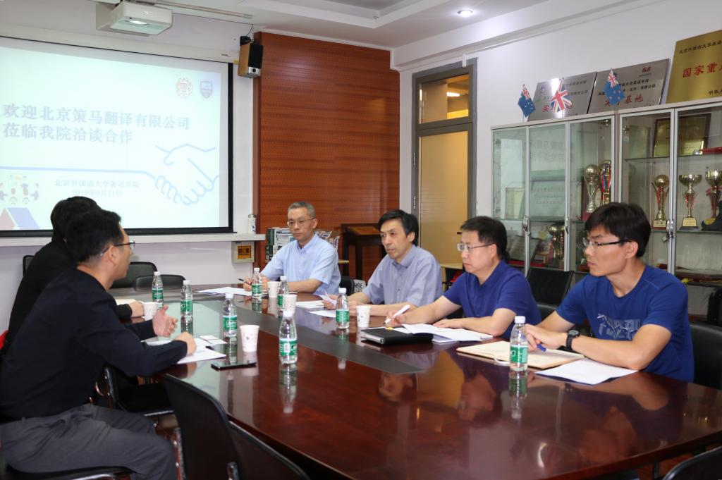 文毅介绍了策马集团基本情况。策马集团系联合国官方翻译服务供应商,从事翻译服务、翻译教育培训、会展服务、外语猎头服务、翻译类计算机软件开发等业务,是中国最著名的全球多语种语言服务供应商之一。胡馨友就正在开展的2019中华口译大赛的情况进行了详细介绍,并就大赛总决赛的合作事宜向学院领导进行介绍说明。