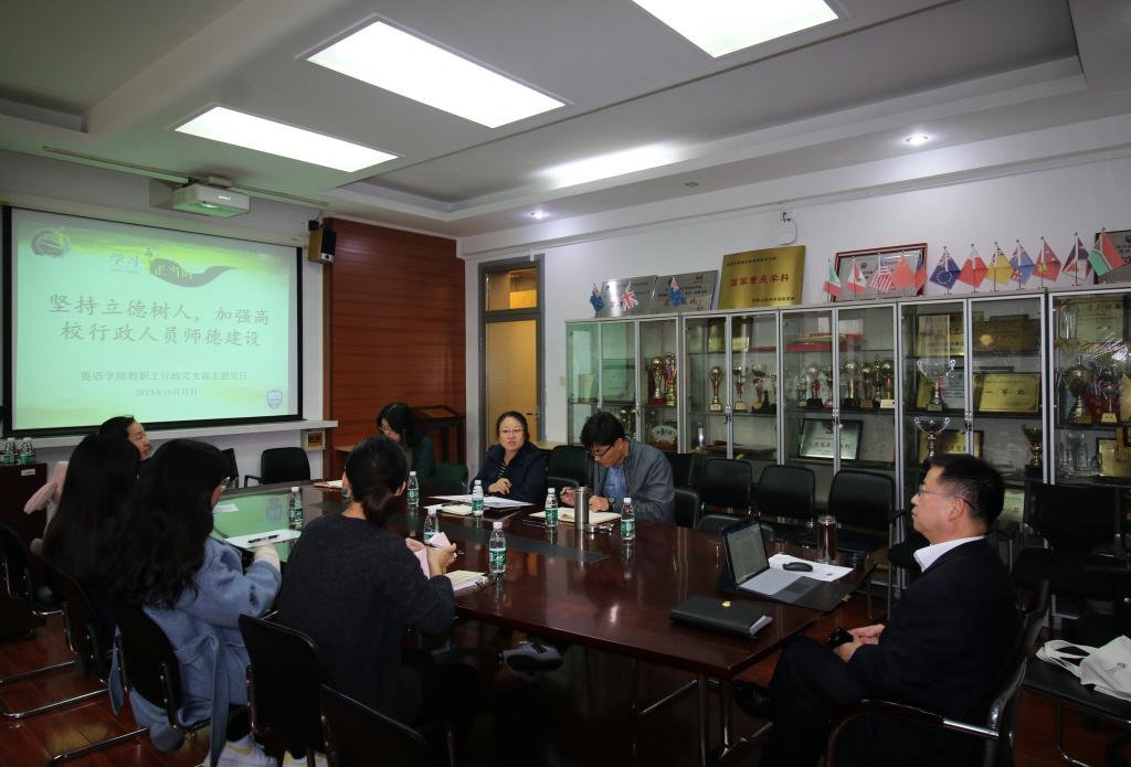 2019年10月17日下午,澳门pg官方电子平台教职工行政党支部在英语楼115会议室召开“坚持立德树人,加强高校行政人员师德建设”教育学习活动。
