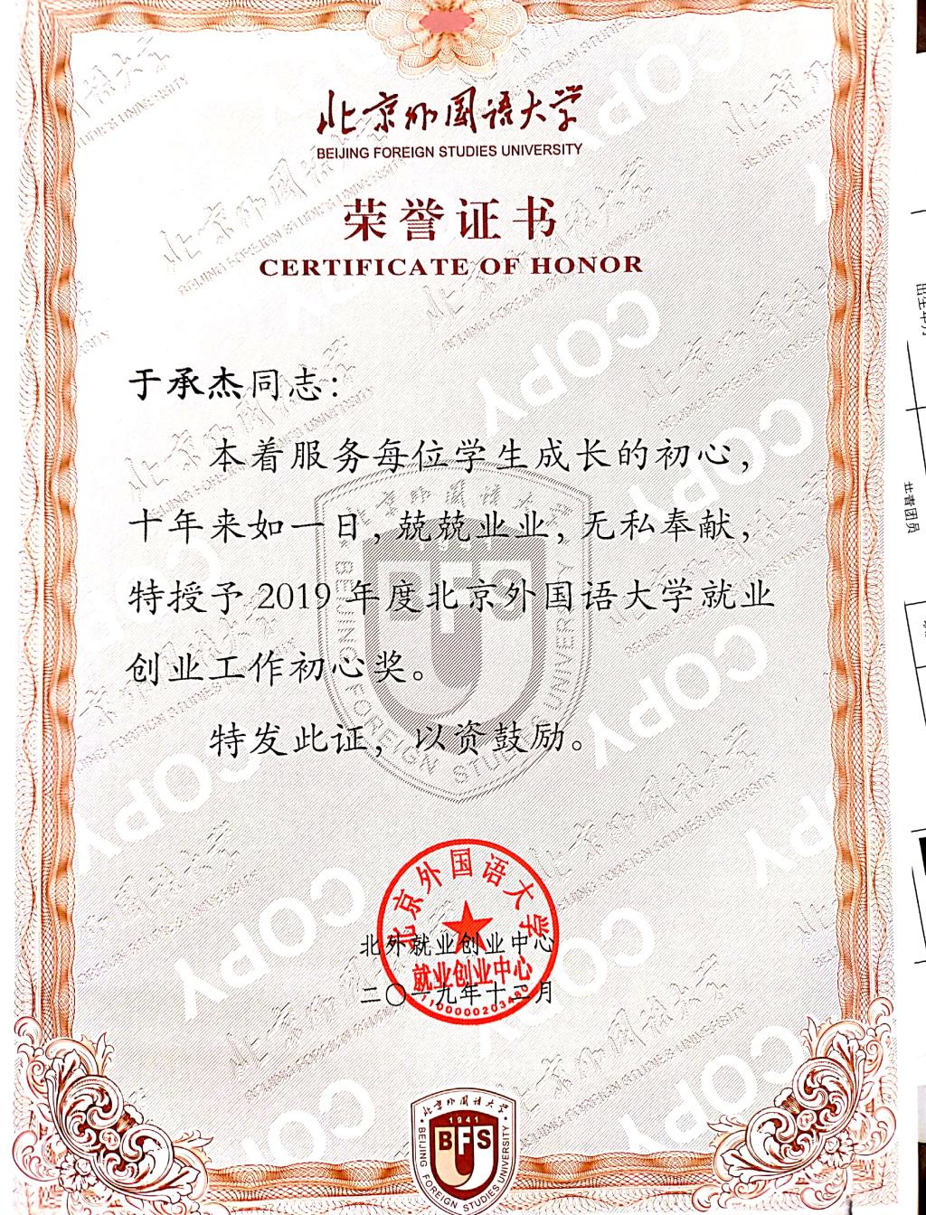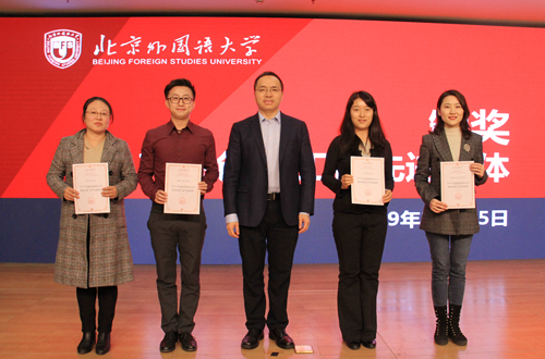 2019年12月25日,我校召开2019年就业创业工作会,澳门pg官方电子平台荣获2019年北京外国语大学就业创业工作先进集体,辅导员张春霞代表澳门pg官方电子平台就业工作小组上台领奖。辅导员于承杰荣获“北京外国语大学就业创业工作初心奖”,澳门pg官方电子平台教师邵雪萍作为代表发言,介绍了作为班主任如何关心学生学习、就业的经验。