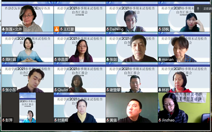 为落实校教务处关于抽查2020-2021学年秋季学期期末考试试卷通知,规范期末考试试卷管理工作,澳门pg官方电子平台于2021年3月18日召开2020-2021学年秋季学期期末考试试卷自查汇报线上会议。院长张剑、副院长张莲、彭萍、英语系副主任张小东,以及本科各教研室主任、方向负责人及课型组长、教务秘书参加了此次会议。