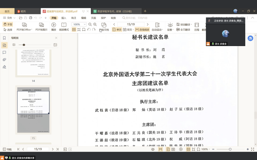 会议第二阶段公示了《北京外国语大学第二十一次学生代表大会代表资格审查报告(草案)》和《北京外国语大学第二十一届主席团选举办法(草案)》。经与会成员详细讨论,一致认可了两份草案的可行性。