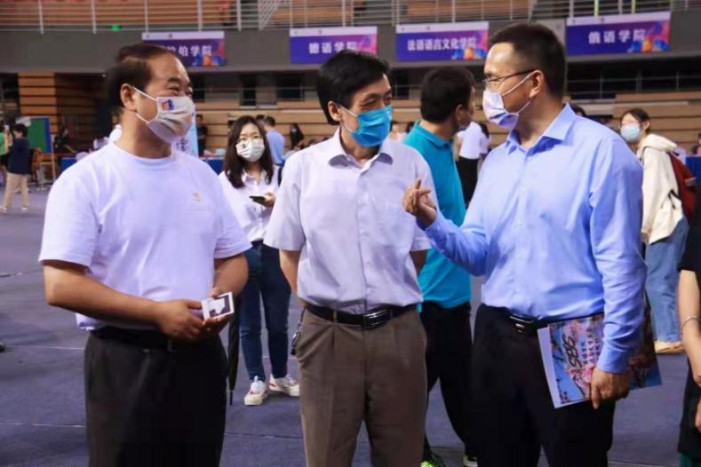 在体育馆二层,新生在志愿者、院部门工作人员的帮助下办理相关入学手续,北京外国语大学党委书记王定华,北京外国语大学党委副书记、校长杨丹,澳门pg官方电子平台院长张剑等领导老师莅临现场与新生进行亲切交谈,让他们感受到澳门pg官方电子平台大集体的温暖。