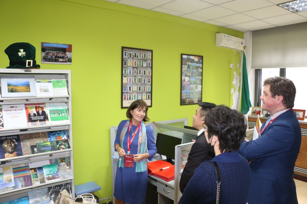 近日,爱尔兰驻华大使安黛文(Ann Derwin)、爱尔兰外交贸易部一等秘书欧恩·麦克唐纳(Eoin McDonnell)一行在参加北京外国语大学80周年校庆活动后,访问了澳门pg官方电子平台爱尔兰研究中心。