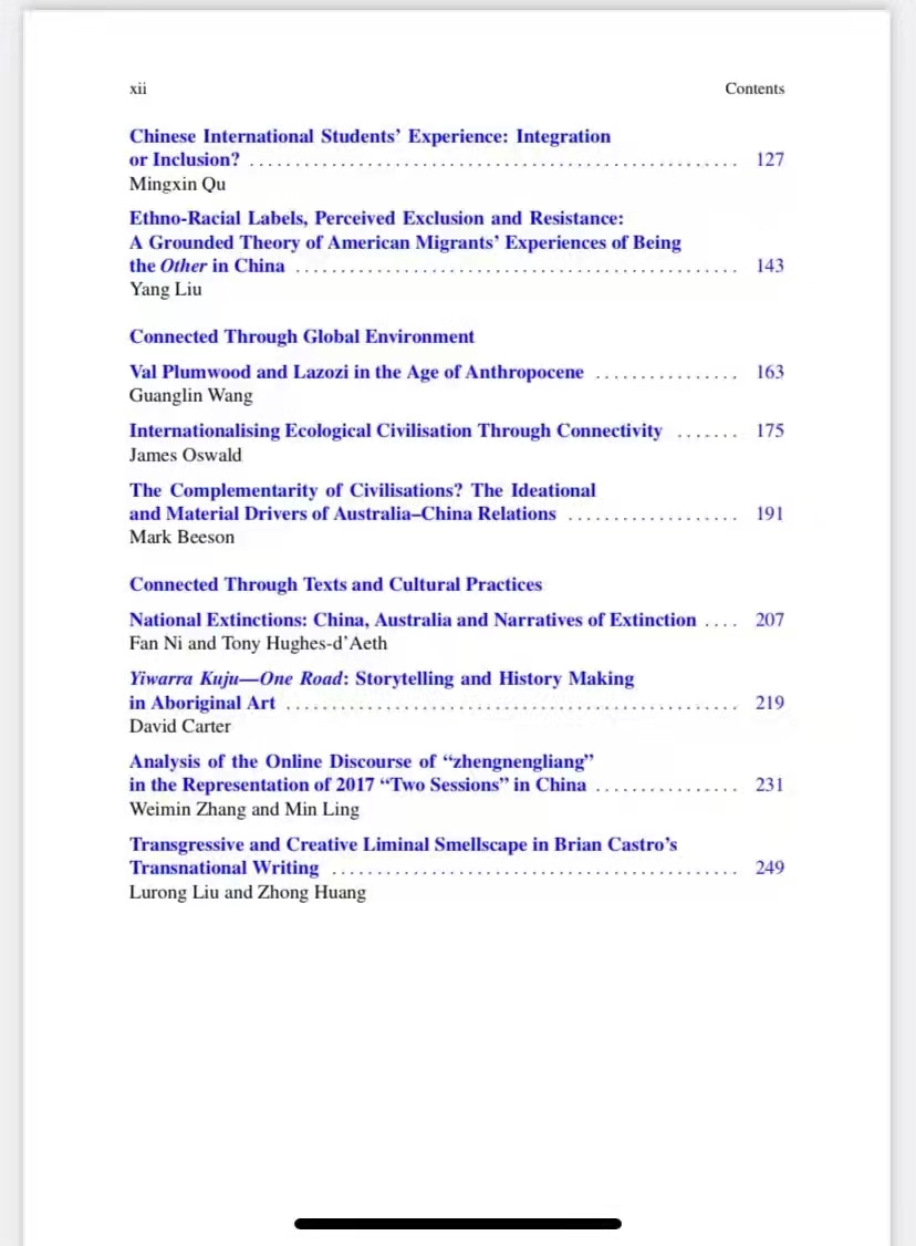 论文集延续了Springer出版社“Encounters between East and West: Intercultural Perspectives”系列的关注点,围绕“Transcultural Connections:Australia and China”(中澳跨文化联系)的主题,集结出版了2019年CATS会议期间的优秀论文及部分特邀稿件,由Greg McCarthy教授、孙有中教授、Xianlin Song副教授主编。澳门pg官方电子平台刘杨博士、胡丹博士与澳研中心研究生文馨供稿。