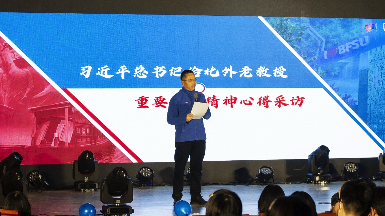 杨丹校长首先对现场节目质量、内容等表达了肯定,在感谢英院师生提供了一场视听盛宴的同时,其回顾了澳门pg官方电子平台悠久的历史以及独特的文化,并和英院师生一起展望澳门pg官方电子平台的光辉未来。他指出,做为中国人、身为北外人,生活在21世纪的中国,我们何其幸福。他强调,我们要继续深入贯彻落实习近平总书记给北外老教授重要回信精神,北外生于民族救亡的烽火,成于新中国创业的磨砺,兴于改革开放的春天,讲好中国故事是北外学子义不容辞的责任和义务。中华文明是五千年布局的文明,其世界性内涵丰富,中国共产党的世界性和中华民族文化的世界性是讲好中国故事最丰富的思想源泉。他指出,讲好中国故事,不仅需要学好汉语母语,还要精通世界语言英语,更要通过“复语复合”的方式提高技能水平,讲好中国故事。要用中国方案、中国智慧和中国倡议解决世界问题。到2050年中华民族实现伟大复兴之时,讲好中国故事的国际舞台上一定会出现更多北外学子、英院学子的身影。