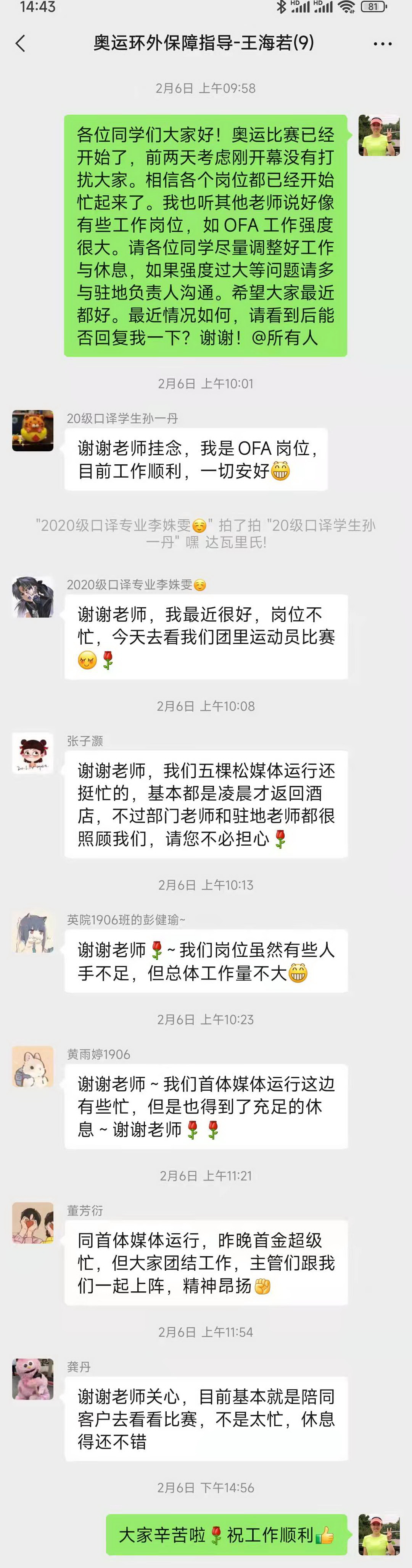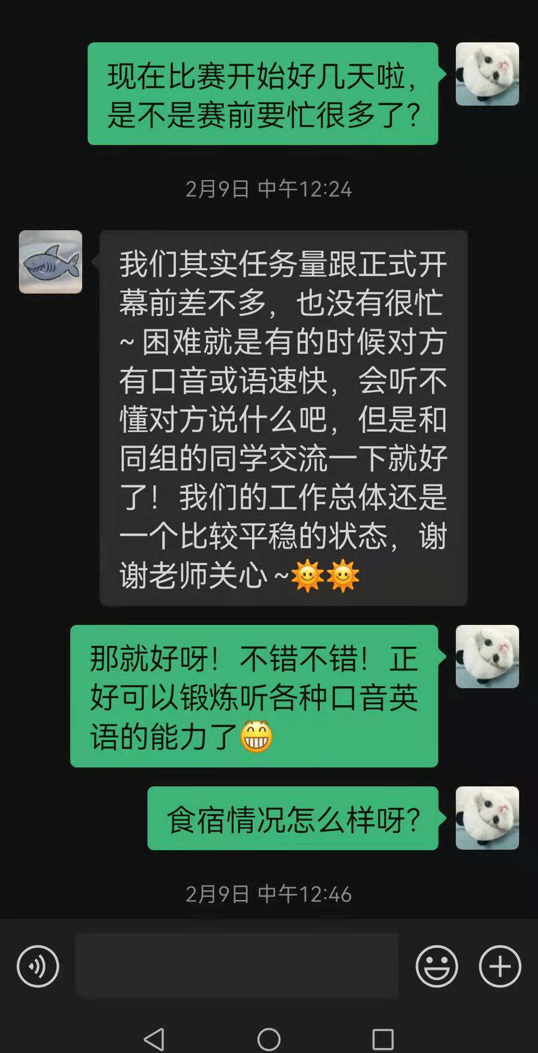 青年教师吴兆红感叹道“作为冬奥志愿者闭环外指导教师,非常高兴也非常羡慕自己的学生可以作为志愿者参与冬奥、服务冬奥,相信同学们都收获很大,为同学们感到开心!”