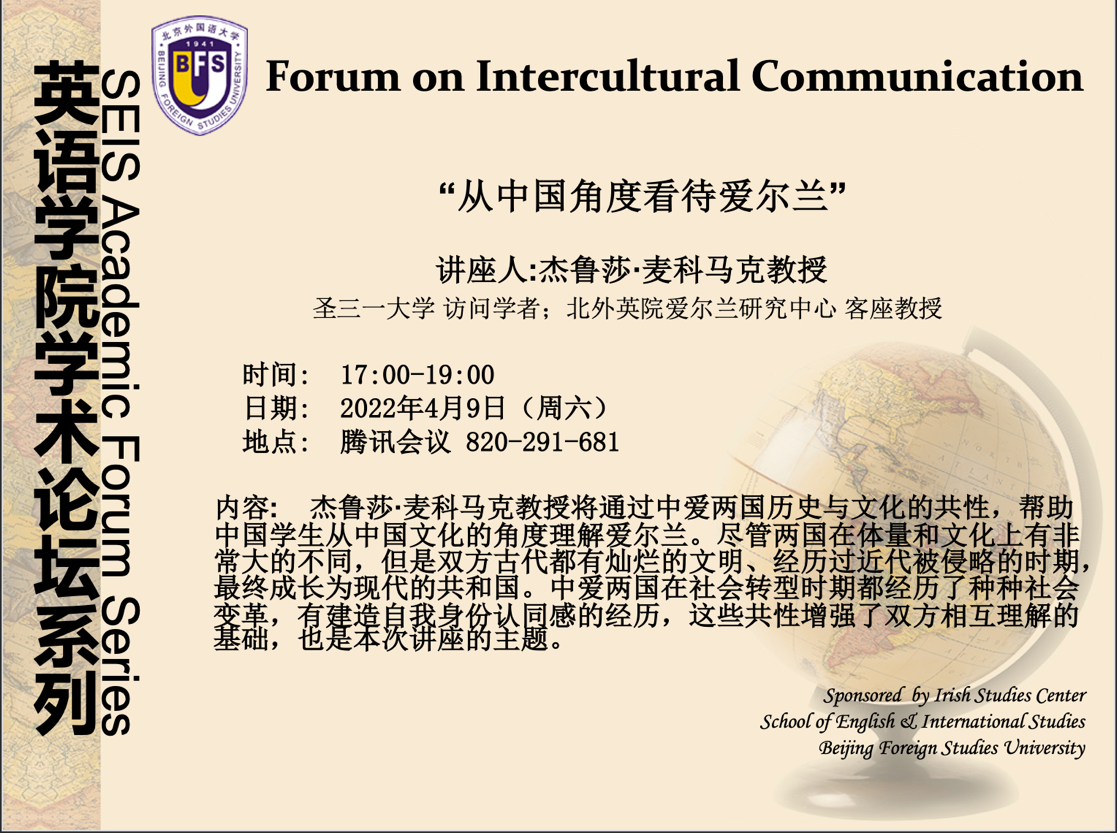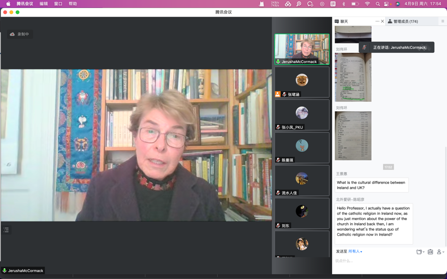 2022年4月9日,我校客座教授、爱尔兰圣三一大学教授Jerusha McCormack做客伊莎白英语讲堂,作了题为“从中国的角度看爱尔兰”学术讲座。讲座由北外澳门pg官方电子平台爱尔兰研究中心主任王展鹏教授主持。陈丽教授、张珺涵、爱研学生、其他院系对爱尔兰有兴趣的学生、以及校外师生等170余人参与了本次讲座。