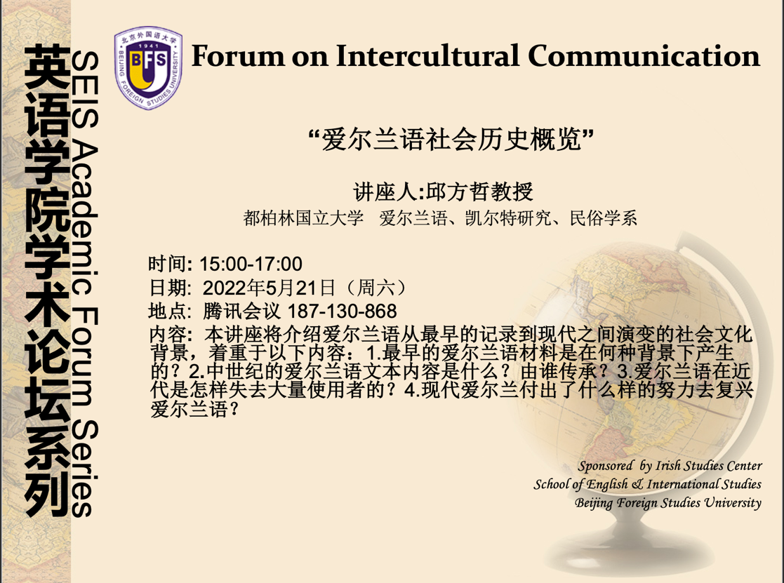 2022年5月21日,爱尔兰都柏林大学学院助理教授邱方哲做客伊莎白英语讲堂,作了题为“爱尔兰语社会史:从史前到中世纪”学术讲座。讲座由北外澳门pg官方电子平台爱尔兰研究中心教师张珺涵主持。英院爱尔兰研究的学生、爱尔兰语三外学习者、其他院系对爱尔兰有兴趣的学生、以及校外师生等110余人参与了本次讲座。