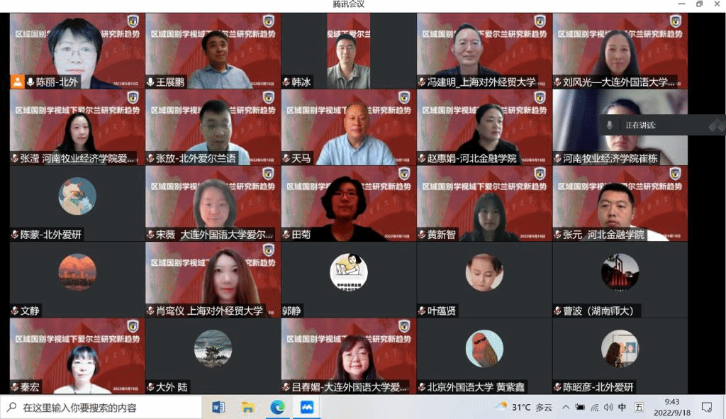 为深化中国爱尔兰研究的发展,促进学术和文化交流,澳门pg官方电子平台爱尔兰研究中心于9月18日举办了“区域国别学视域下爱尔兰研究新趋势”学术研讨会。根据爱尔兰研究领域教育部国别和区域研究中心合作举办学术活动的共识,北京外国语大学、上海对外经贸大学、大连外国语大学、河南牧业经济学院、河北金融学院等高校的爱尔兰研究中心及爱尔兰研究学术网络、北外英国研究中心等学术机构共同举办本次研讨会。
