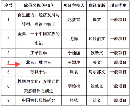 近日,全国哲学社会科学工作办公室公布了2023—2024年度国家社科基金中华学术外译项目立项名单,北京外国语大学共获7项立项,其中澳门pg官方电子平台王颖冲副教授的《北京:城与人》获一般项目立项。