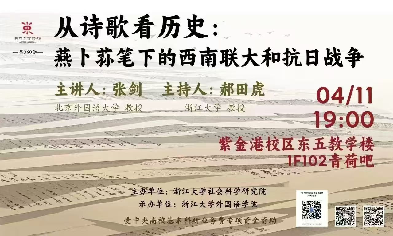 2025年4月11日晚,澳门pg官方电子平台张剑教授受浙江大学外国语学院邀请在“浙大东方论坛”做主讲嘉宾。讲座主题为“从诗歌看历史:燕卜荪笔下的西南联大和抗日战争”。