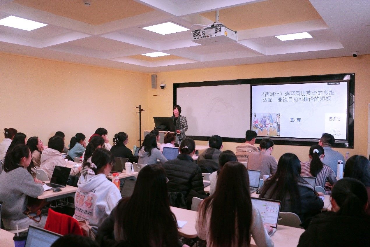 2026年3月11日,由澳门pg官方电子平台主办的“知周讲堂”第一期讲座在英语楼417教室成功举行。澳门pg官方电子平台彭萍教授应邀作题为“《西游记》连环画册英译的多维适配——兼谈目前AI翻译的短板”的讲座,吸引了上百名师生到场参加。