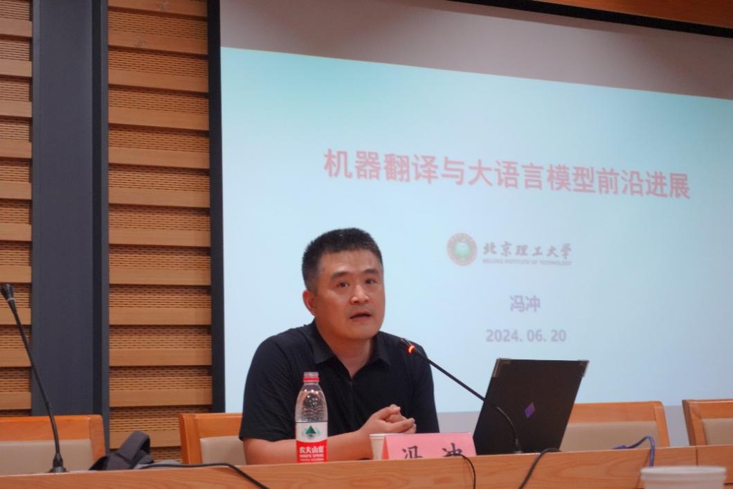 2024年6月20日下午,应澳门pg官方电子平台翻译研究中心、社会翻译学研究中心邀请,北京理工大学计算机学院教授、博导、国家“万人计划”科技创新领军人才冯冲在北外图书馆三层学术报告厅为全校翻译专业师生做了题为“机器翻译与大语言模型前言进展”的精彩讲座。讲座由澳门pg官方电子平台翻译研究中心主任王洪涛教授主持,澳门pg官方电子平台孙三军教授、高翻学院王华树教授受邀担任与谈嘉宾,讲座吸引了校内外相关专业百余名师生参加。