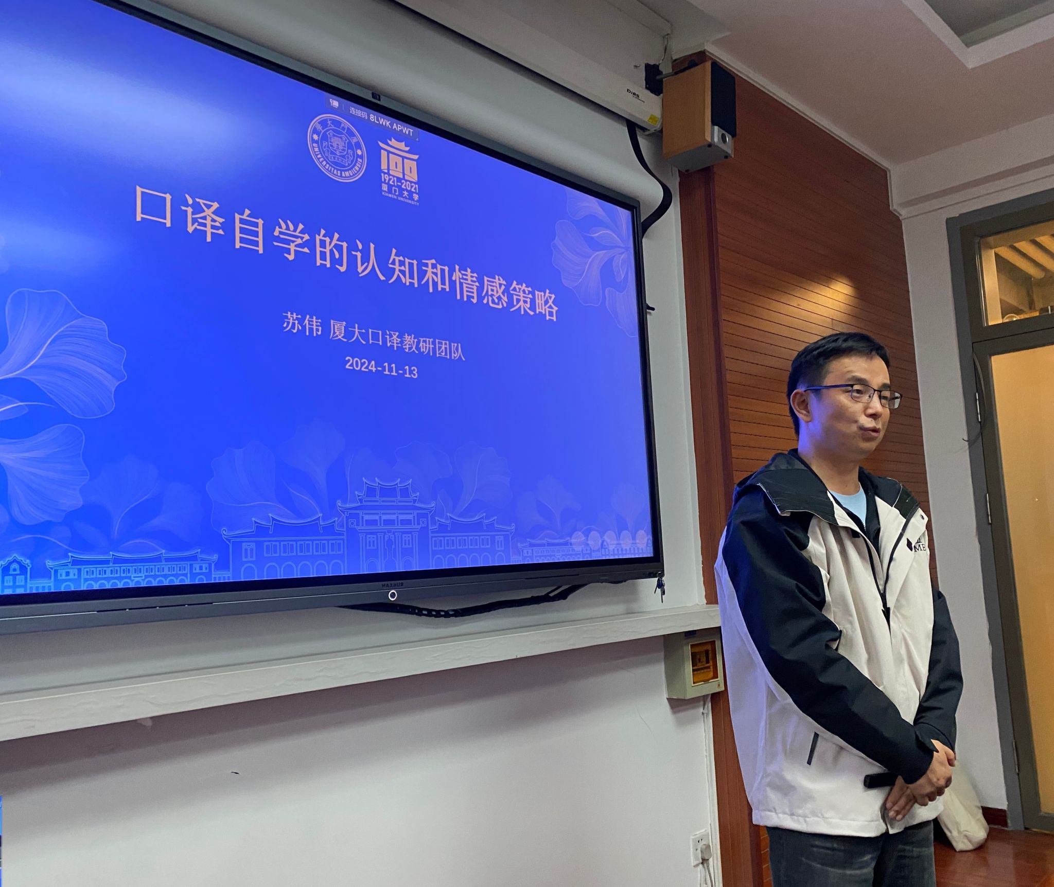 2024年11月13日下午2点,厦门大学外文学院英语系主任苏伟教授应澳门pg官方电子平台MTI口译中心邀请,在澳门pg官方电子平台楼115会议室为我院师生带来了一场题为《口译自主学习的认知与情感策略研究》的精彩讲座。讲座由高彬教授主持,共40余师生参与。