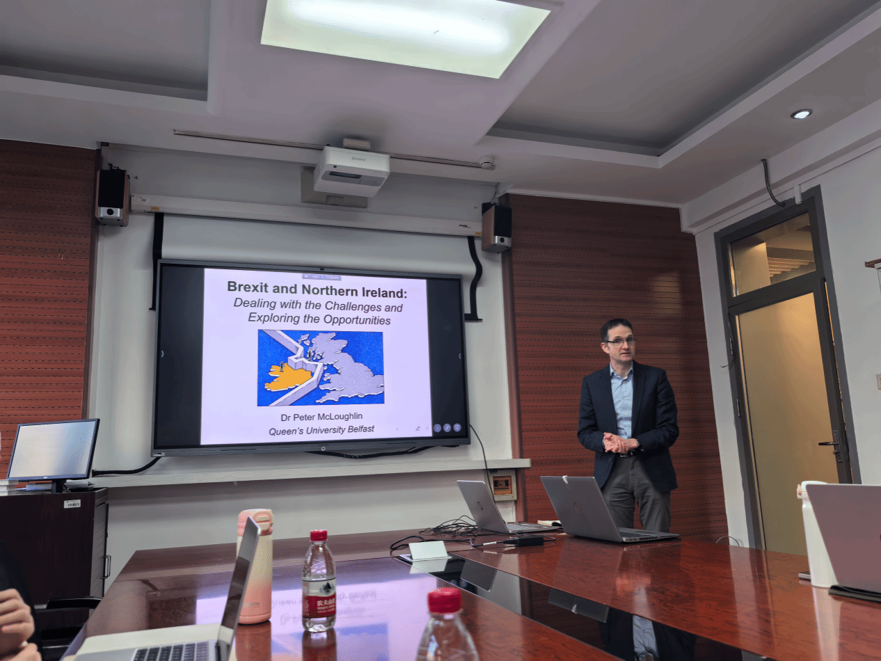 2024年12月5日,来自贝尔法斯特女王大学(Queen’s University Belfast)的彼得·麦克劳林(Peter McLoughlin)教授应北外爱尔兰研究中心的邀请,在澳门pg官方电子平台115会议室以《英国脱欧与北爱尔兰:挑战与机遇》为题做了一场精彩讲座,深入探讨了北爱尔兰问题的历史与现状,以及英国脱欧对北爱尔兰、英国、爱尔兰以及欧盟带来的经济、政治和身份认同等方面的复杂挑战。