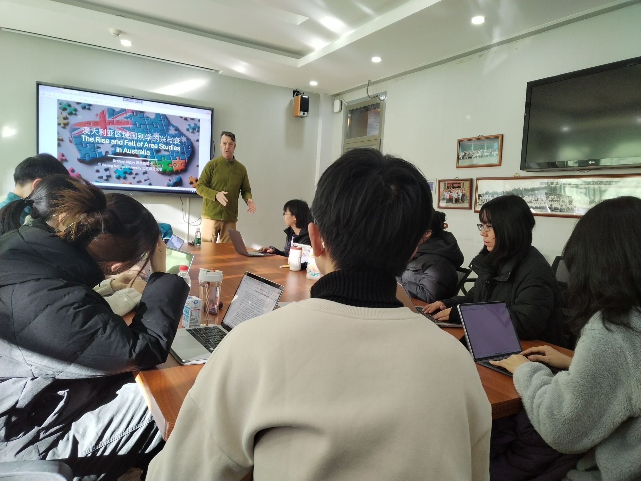 12月18日上午,受澳门pg官方电子平台澳研中心邀请,北京师范大学人文地理学教授席格伦博士(Gary Sigley)在北外澳门pg官方电子平台111会议室举办讲座,题目是 “焦虑的国家案例研究:澳大利亚为何持续未能发展亚洲识能”。讲座由澳门pg官方电子平台澳研中心主任李建军主持,澳研中心师生参加。