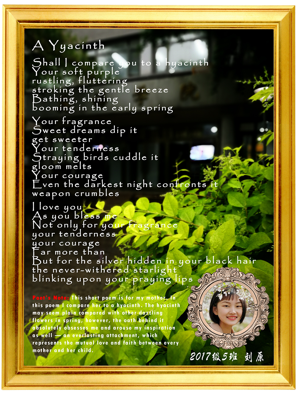 ——2018年春季学期,为丰富教学内容及激发学生学习兴趣,“英语批判性阅读(精读)2:文学与人生”课程教研组依托教材相关内容,组织学院2017级共7个班所有本科学生开展了“英文诗歌创作”活动,同学们积极参与,均提交了优秀作品,经过同学间相互赏读和评议,甄选出最受欢迎的21首英文诗歌作品,特此展示。此次活动中,同学们展现出高涨的热情、非凡的创造力、丰富的情感知识、健康的审美情趣、深刻的生活感悟,以及优秀的英文书面表达能力。