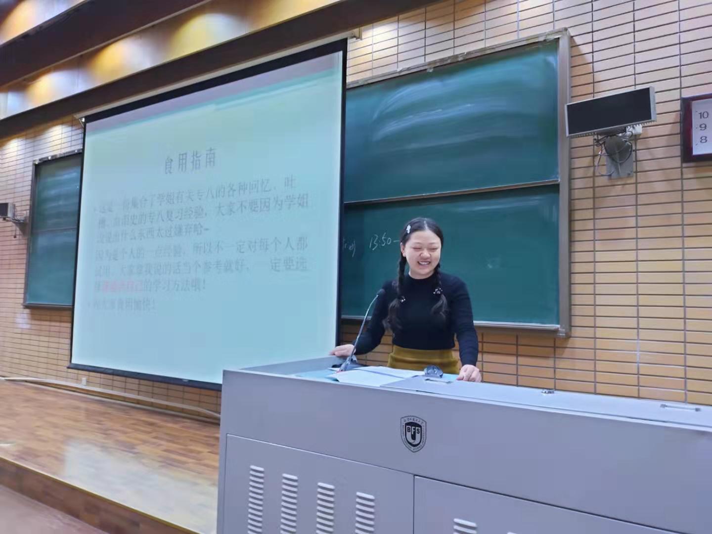 之后2019级翻译学专业研究生董思奇进行英语专八经验分享。董思奇同学是澳门pg官方电子平台2015级本科生,在2019年英语专八考试取得优秀的成绩。她介绍了英语专八考试的五大题型和收卷模式,提醒大家在考试时注意把握时间,平时要参照正式考试的时间安排多进行模拟。寒假期间并针对自己的弱项进行复习,如词汇量、阅读速度、改错、作文等。