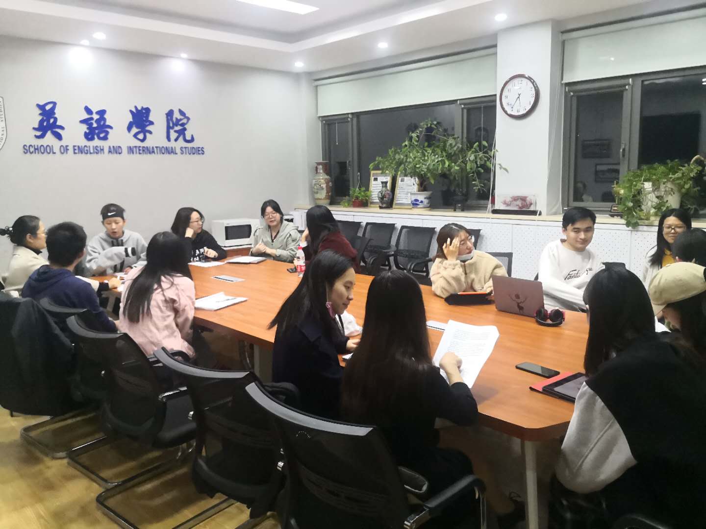 在主持人简单开场后,两个支部的同志进行了简单的自我介绍,增进彼此的了解。随后,两支部成员分为九个小组,由研究生口译支部的同志带领本科生支部同志深入学习讲话内容,探讨译文翻译策略。