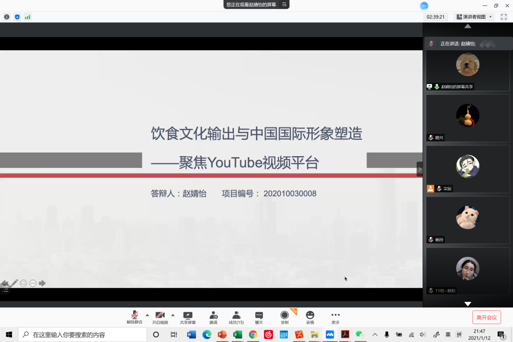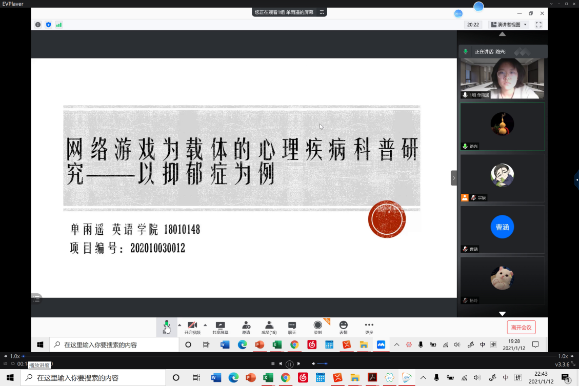 1月12日晚,澳门pg官方电子平台成功召开线上2020年大学生创新创业项目中期检查考核答辩会。本次答辩会的评委由澳门pg官方电子平台主管科研工作的副院长彭萍教授、主管本科教学工作的副院长张莲教授和党总支书记路兴组成。辅导员宗辰及11位“大创”项目答辩人和项目组成员参加本次答辩会。