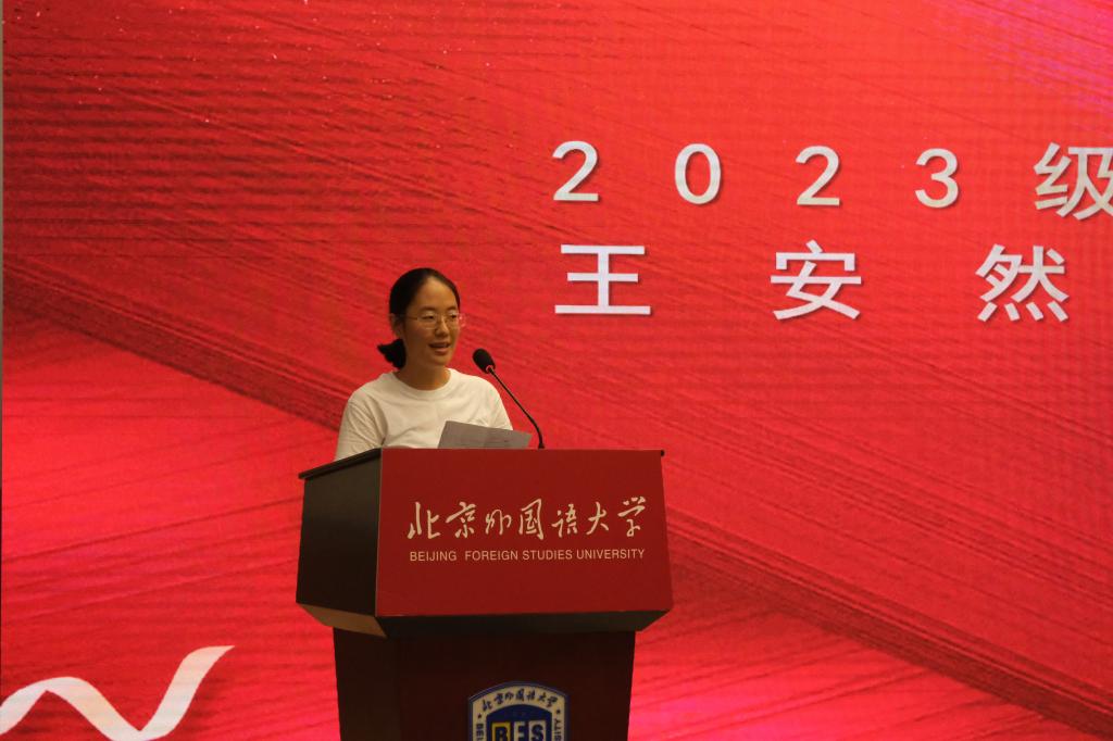 2021级本科生刘辰阳同学作为老生代表发言,与同学们分享了自己在北外的学习经历,鼓励大家踊跃探索个人兴趣方向,丰富知识体系,提升自身学术能力。2023级本科生新生代表陈焕文同学表达了自己对北外的向往、圆梦的喜悦以及奋斗的决心,在未来的学习生活中,他希望和大家一起以“北外人”、“英院人”的身份,奔走在“为人民服务”的第一线,一同开启人生的新阶段。2023级硕士生新生代表王安然同学提出,要学会学海无涯“乐”作舟,利用好英院所提供的丰富资源,向老师虚心求教,与同学学习研讨,成为有家国情怀、有全球视野、有专业本领的多语种复合型人才。