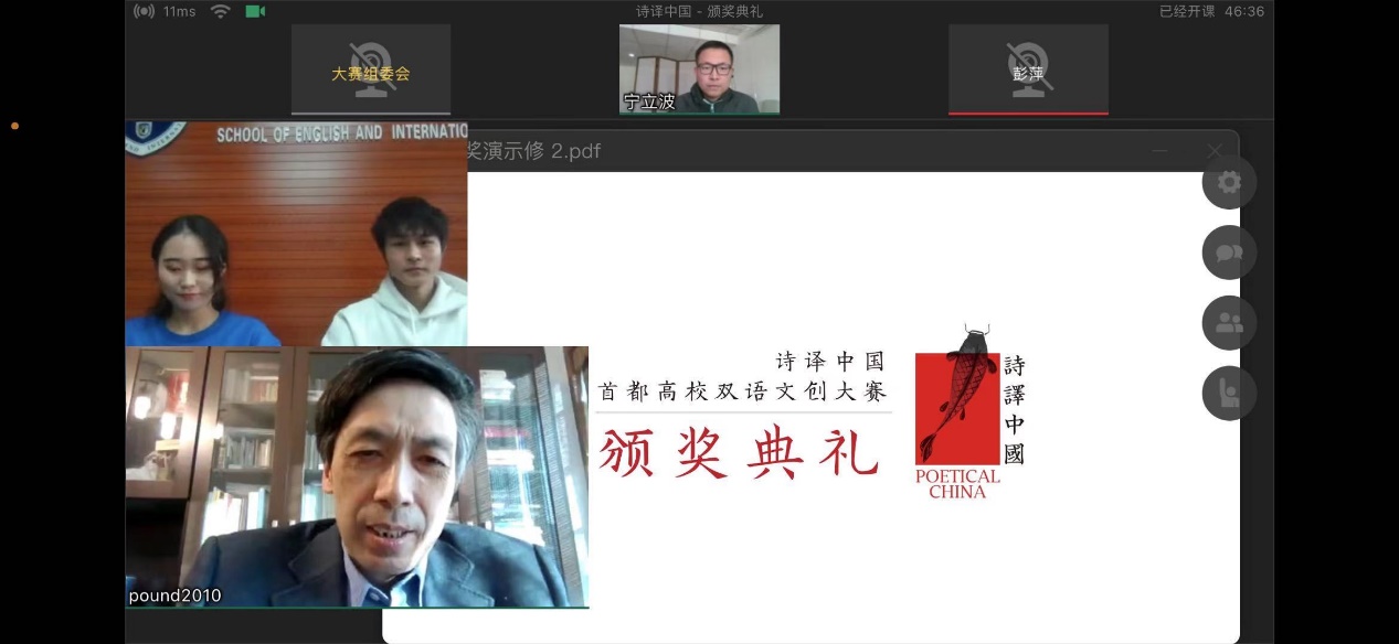 本次活动尝试结合中国传统诗歌文化,以创新形式开辟竞技空间,为参赛者提供检验专业语言能力和学习交流的平台。大赛从报名到评选历经一个多月,得到了首都各大高校师生的响应与支持。中国传统文化传承及中西文化融会贯通任重而道远,今后澳门pg官方电子平台将继续秉持“知周中外,道济天下”的院训,进一步加强校企合作,汇聚多方力量,积极寻求传统文化与专业学习的契合点,努力培养全面发展的高素质复合型英语、翻译专业人才。