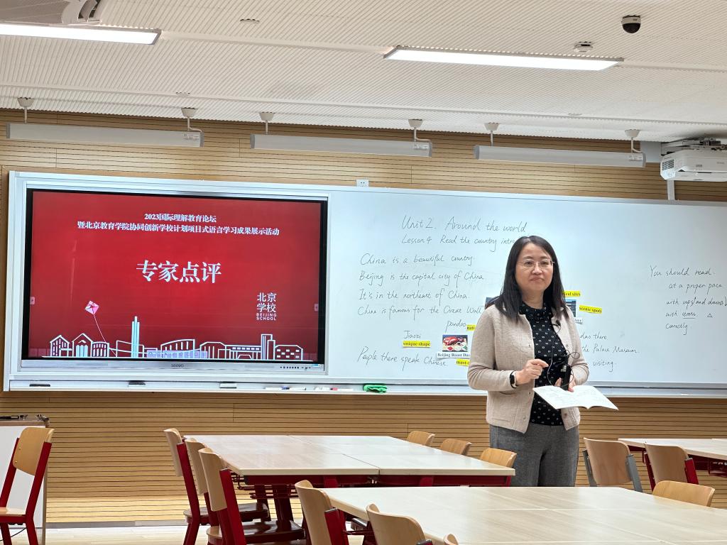 首先,师生代表观摩了由北京学校小学五年级师生带来的一堂精彩纷呈的公开课。课程教师通过丰富的肢体语言和高效的课堂提问,让学生们深度参与到课堂中,领悟语音学习的技巧。在“Country Day”项目说课环节,师生代表更加深刻地了解本次项目成果展示活动的教学意义和教学目标。公开课展示结束后,杨鲁新对公开课课堂设计和教学材料进行点评,对北京学校重视语音教学表示肯定。