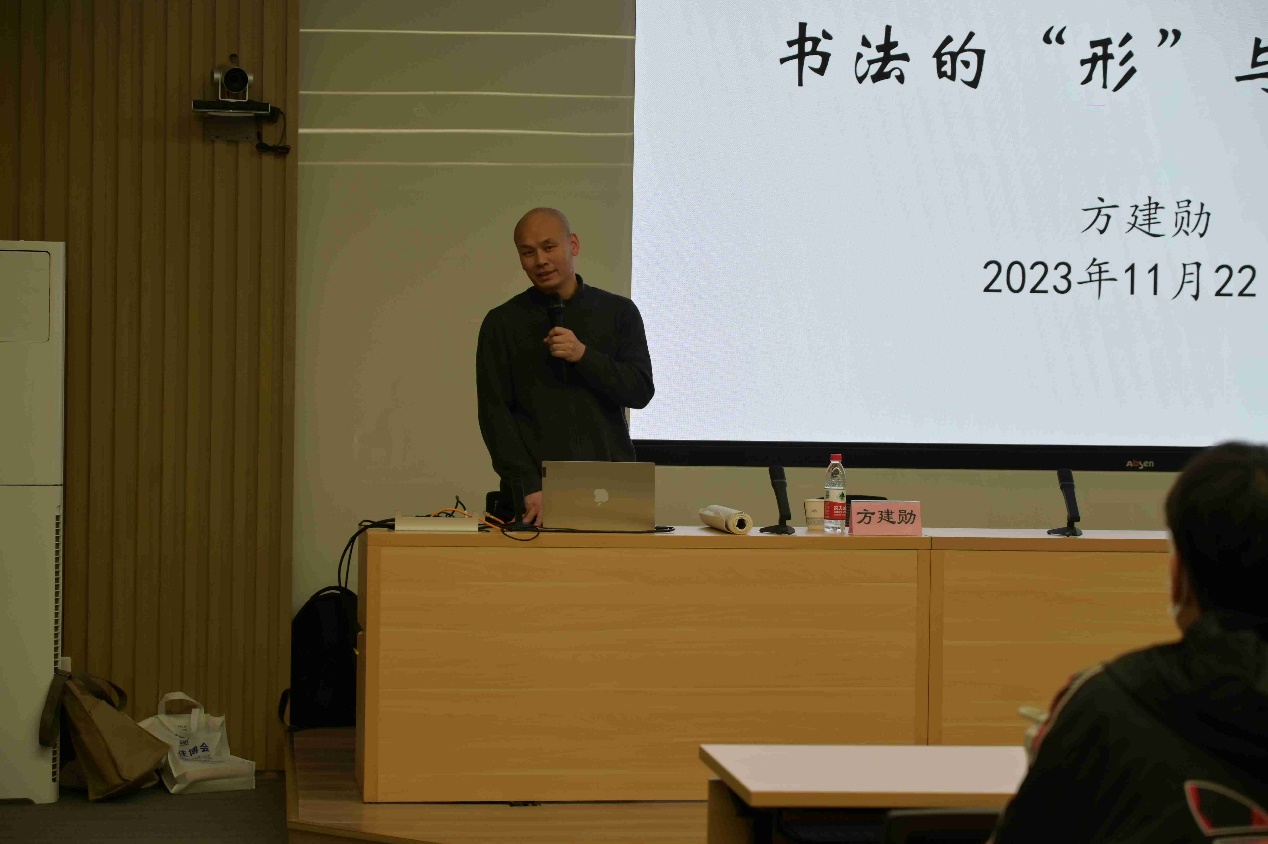 2023年11月22日,由校工会主办、澳门pg官方电子平台承办的“书法的‘形’与‘象’”讲座在晨读厅成功举办。讲座邀请北京大学美学博士方建勋为主讲人,校工会常务副主席梁炳超、澳门pg官方电子平台党总支书记王明欣、校工会书法班特聘教师许森林与近百名校内外师生共同参与。