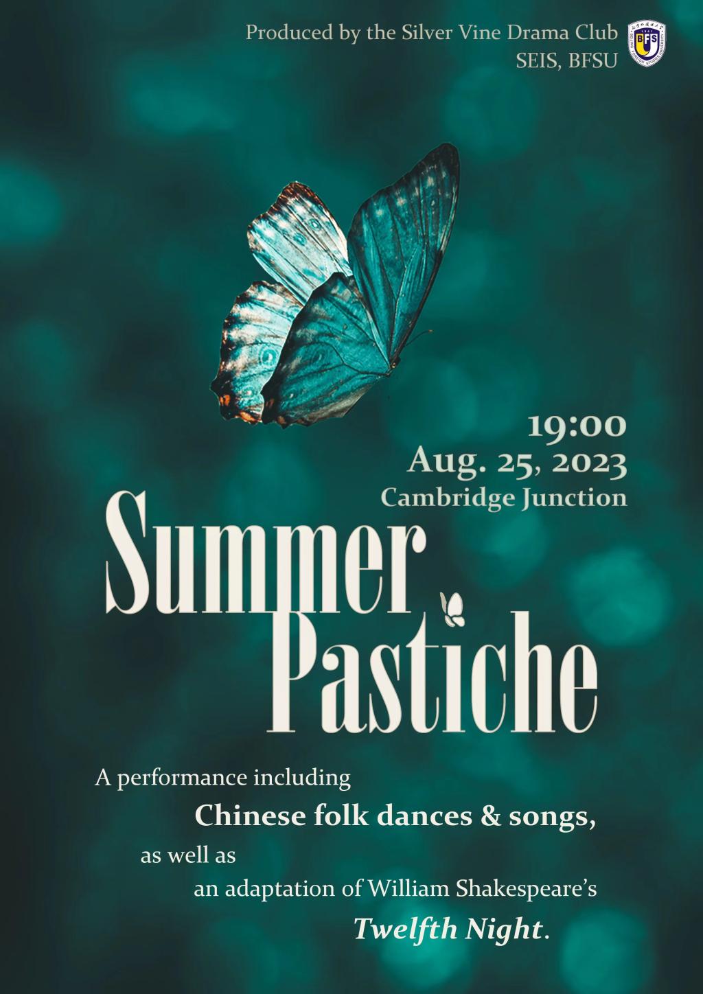 8月25日晚七点,实践团成员在剑桥岔道口演剧厅为观众带来了一场包含《茉莉花》《摘棉花》《梦回敦煌》、莎剧《第十二夜》等九个中英文节目,充分展现了北外师生的语言功底和文艺素养。此次演出共有六个节目包含舞蹈元素,团队中负责舞蹈的同学在演出前参加了Bolly Bhangra Fit Dance Class的东方舞特训,这家工作室教舞者以丰富多样的手语来与动作配合,为舞者在正式演出中自然优美地传情达意提供了思路。