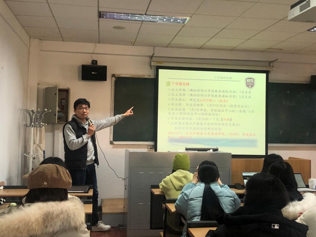 于承杰老师从四个方面向同学们进行了说明。一是2021届毕业研究生就业情况。他分别就2021届毕业生求职信息发布、就业去向、签约进度及求职单位等,进行详细解读分析。并结合疫情的影响,向同学们强调了几个重要的时间节点,以及求职过程中的注意事项。他建议同学们要早明确就业目标,减少自我设限。早做好前期准备,广泛投递简历。早确定落实单位,不要错失就业机会。强调要注意简历和面试过程中的细节,尽快实现从学生到社会人的角色转化。二是签约注意事项。他从三方协议申领、就业网填报以及政审等环节,进行详细的说明,帮助同学们捋清了签约的基本流程。三是毕业手续办理。于承杰老师根据学校关于户档派遣以及党/团组织关系转出的相关要求,向同学们介绍了不同毕业去向下,户档派遣的具体流程以及党/团组织关系转出步骤。四是下学期的安排。他结合往年毕业活动开展情况及疫情防控形势,明确了下半年几个重要时间节点的安排,以便于同学们合理规划时间。他特别强调了毕业论文的重要性,同时指出外出求职要时刻关注疫情发展,明确离/进京政策,做好安全防护。