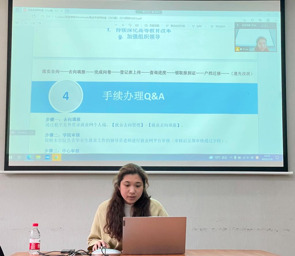 为推进2022届毕业生就业工作的进一步落实,助力毕业生顺利就业,澳门pg官方电子平台于3月10日召开2022届毕业生毕业手续办理答疑会。会议采取了线上为主、线下同步的方式进行。学校就业创业中心高百卉老师主讲,辅导员于承杰主持,澳门pg官方电子平台2022届本科毕业生及研究生毕业生参加。