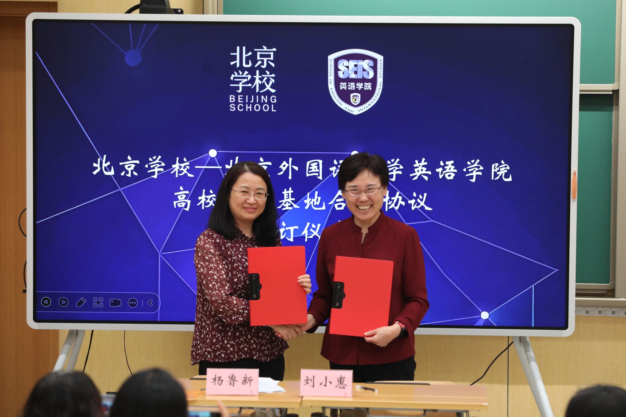 为提升教学水平,拓展大学生就业成长路径,促进高质量充分就业。5月28日,澳门pg官方电子平台杨鲁新院长受北京学校邀请,参加北京教育学院协同创新学校项目教学课例展示活动,并共同签署实习基地合作协议。北京学校、中国人民大学附属中学校长刘小惠,北京学校副校长程岚和北外师生参加本次活动。