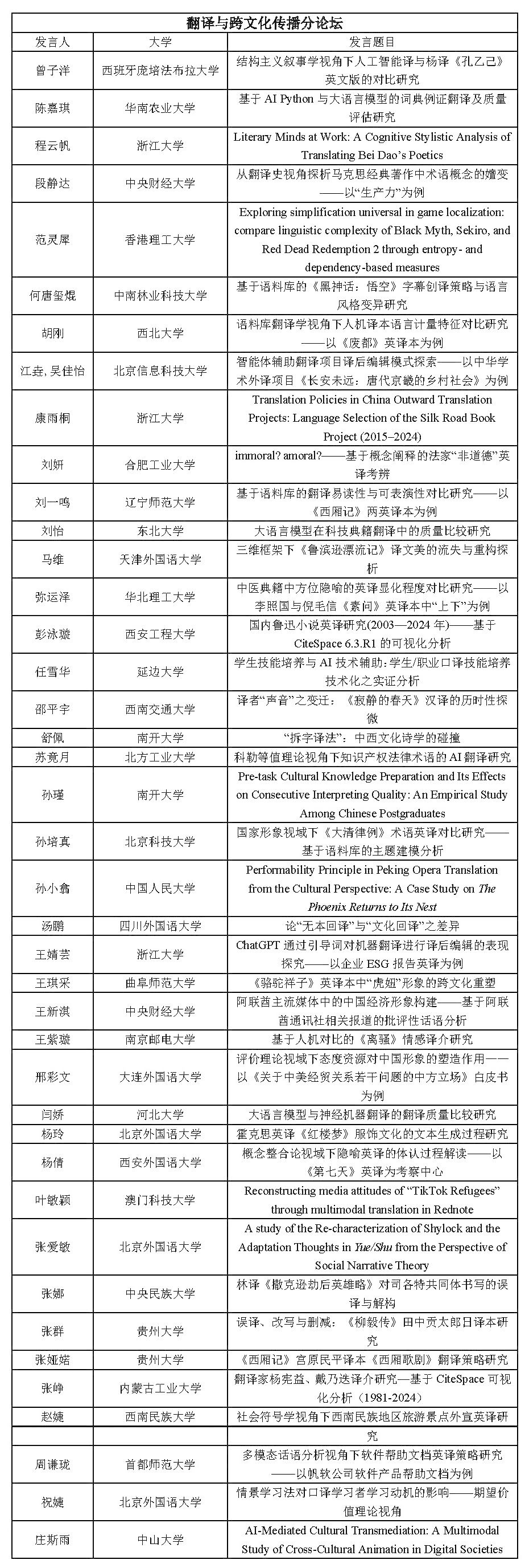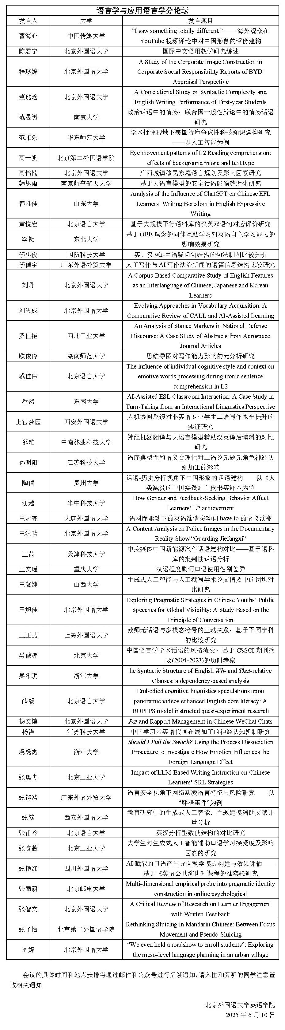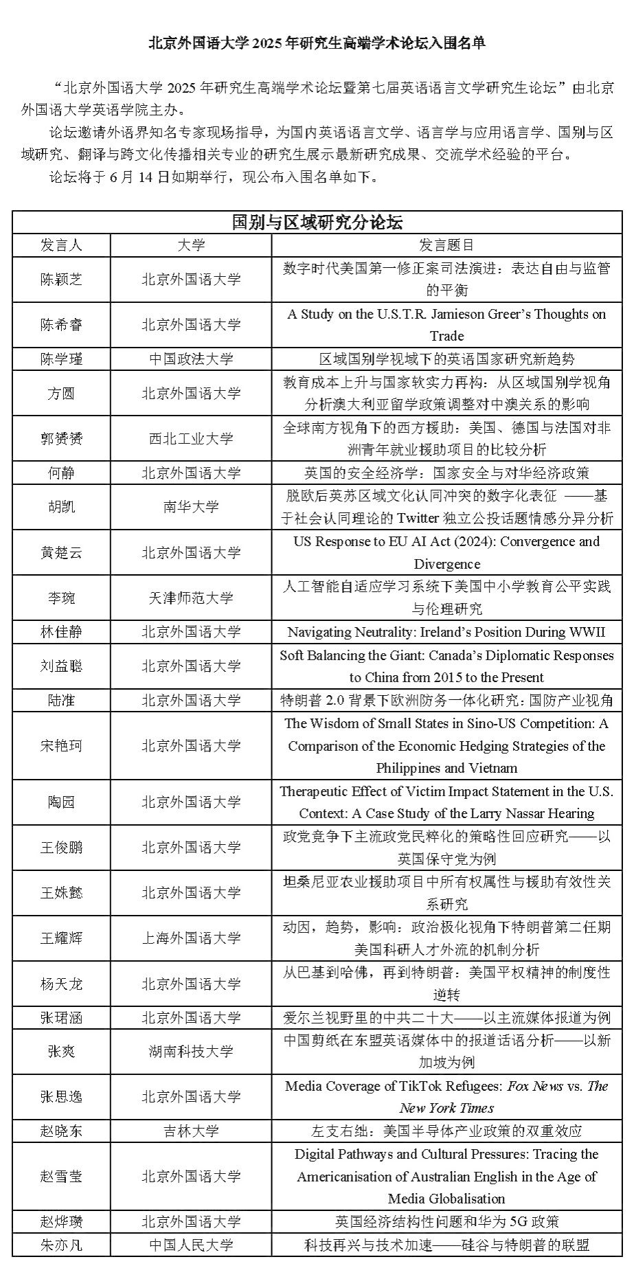 北京外国语大学2025年研究生高端学术论坛入围名单